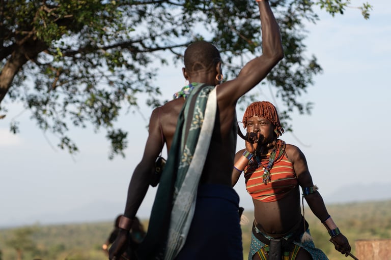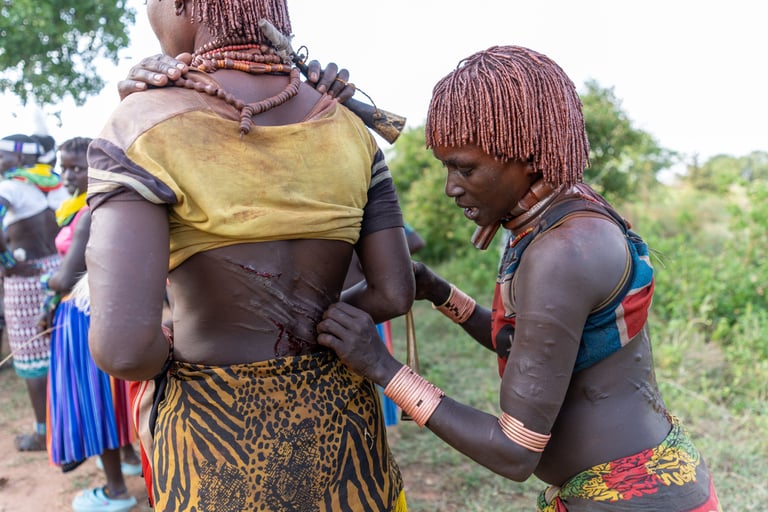 Before the ceremony, the female relatives of the young man go to meet the Maza, men who have just passed the bull-jumping ceremony and who temporarily live apart from the rest of the tribe. They demand to be whipped by these men as a way of showing their dedication and loyalty towards their male relatives. The idea here is to create a strong bond - an obligation - between them.