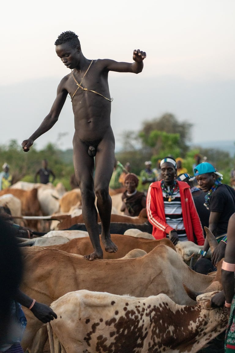 Finally, seven to ten castrated bulls are lined up in a row by the men of the tribe. In the midst of an electric atmosphere and a cacophony of bells and horns, the man must leap up onto, and run over, the several-deep row of cattle 4 times without falling. If he falls, he fails the ceremony and must try again in a year’s time.