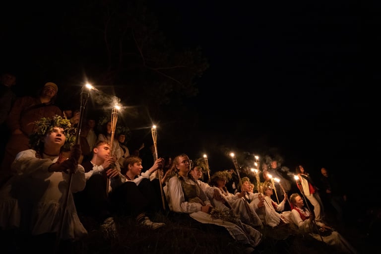 Rasos is a traditional Lithuanian celebration that dates back to pagan times, marking the summer solstice and the power of nature. Held on the night of June 23rd, it honors the longest day and shortest night of the year. The festival is characterized by various rituals, such as jumping over bonfires, searching for the mythical fern flower, singing folk songs, and making wreaths from wildflowers.